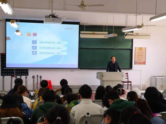 11月6日上午,校纪委书记张裕平在J01A101教室以“制度治党——全面从严治党的重要保障”为题,为外国语学院2019级法语、日语专业同学讲授形势与政策课。他通过典型案例的剖析,强调了治国必先治党,治党务必从严,从严必依法度的重要性,使同学们更加理解了党的十八大以来,我党以前所未有的勇气和定力推进全面从严治党各项举措落实的意义,更加增强了对从严治党必定取得积极成效的信心,坚定听党话跟党走的决心。