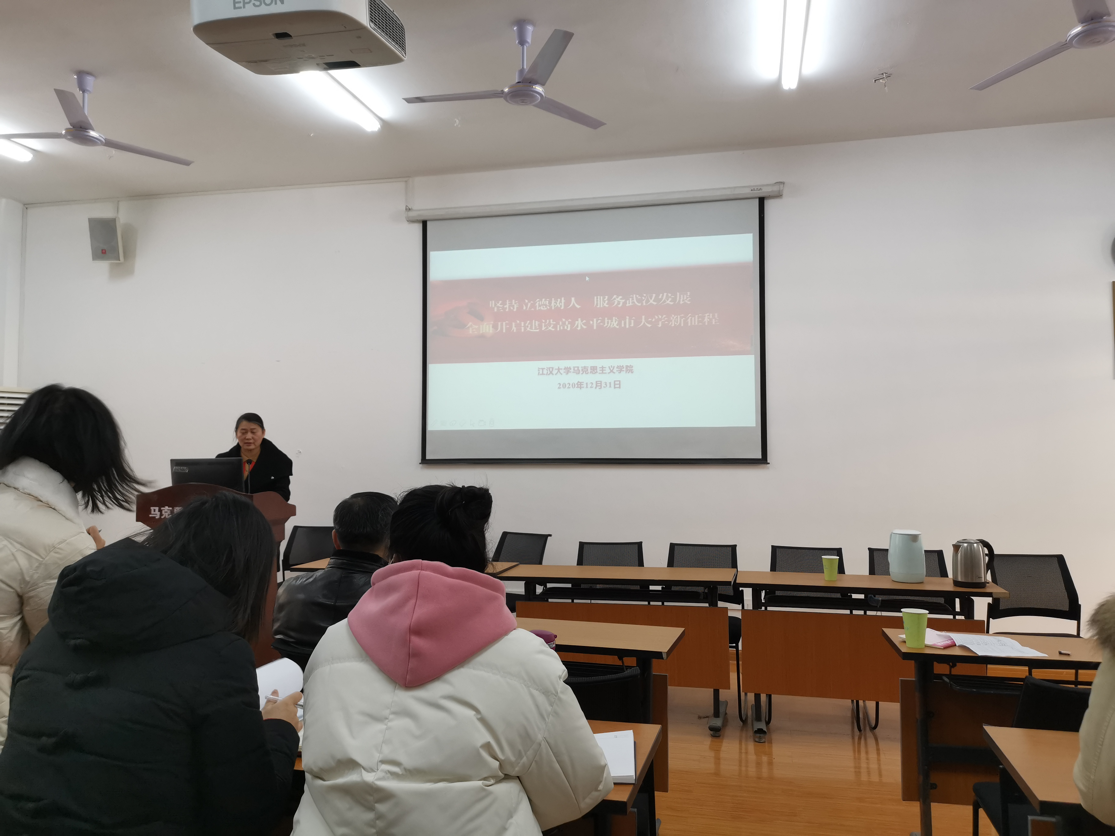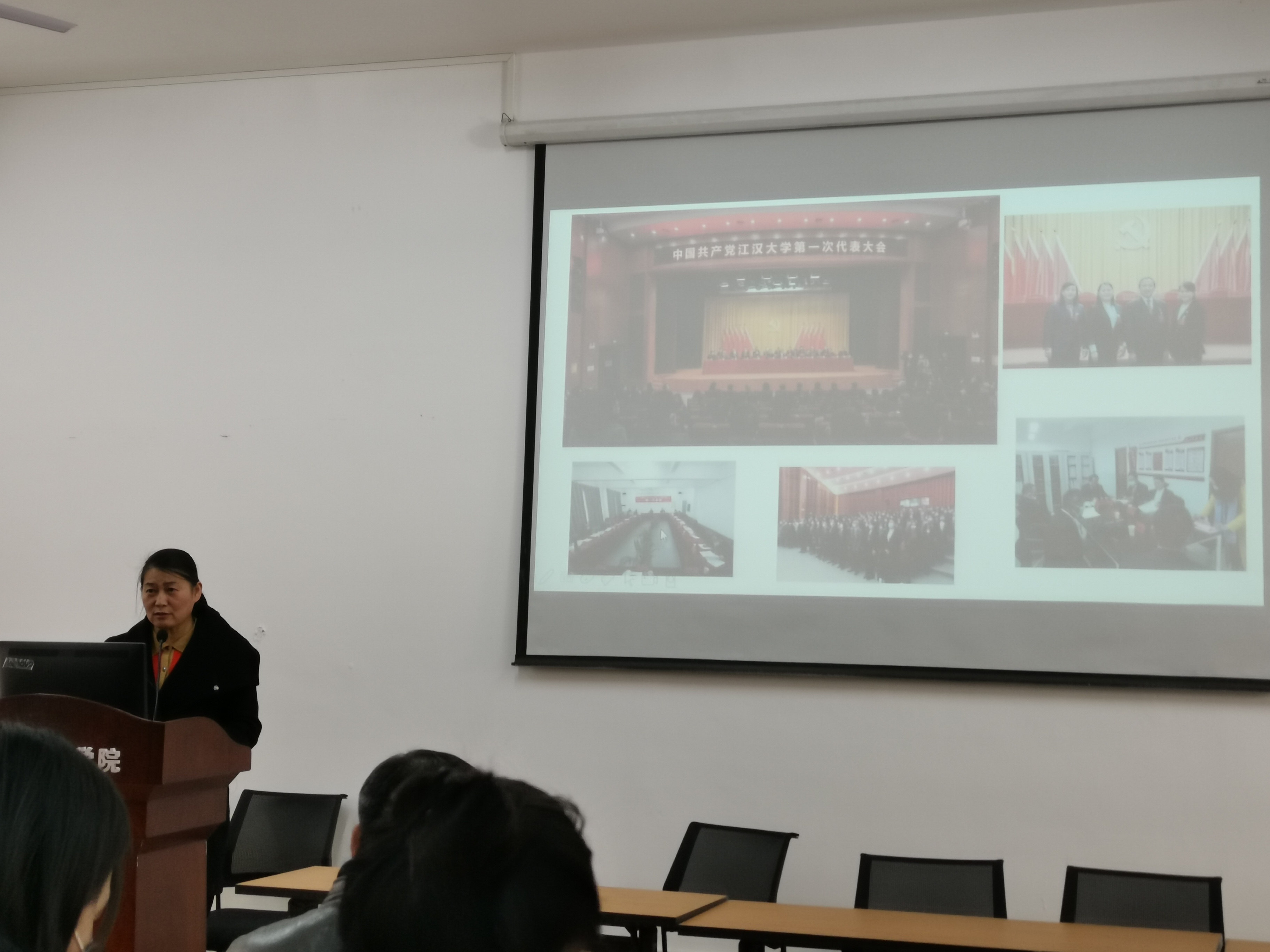 会上,学院党总支书记吕洪雁同志带领全体教职工学习了校党委书记张幸平同志在党代会上作的《坚持立德树人服务武汉发展全面开启建设高水平城市大学新征程》工作报告。并就大会提出的建设高水平城市大学“三步走”发展战略、四大发展理念、八个方面的重点任务和六个方面的政治保证等方面的内容进行了宣讲。