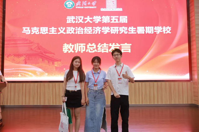 2024年7月20日至7月28日,由武汉大学联合中国高等教育学会马克思主义研究分会、中国政治经济学学会共同主办,武汉大学国产视频 承办的“第五届马克思主义政治经济学研究生暑期学校”如期举办。暑期学校共招收线下学员300多人,线上学员1200多人,学员覆盖全国30个省市自治区130多个单位。线下300余名研究生齐聚武汉大学,在知名学者课堂中围绕政治经济领域的重大理论和现实问题进行研讨学习。国产视频 研究生陈璐佳、姜雪、程凯文成功入选线下学员,并以优异表现顺利结业。
