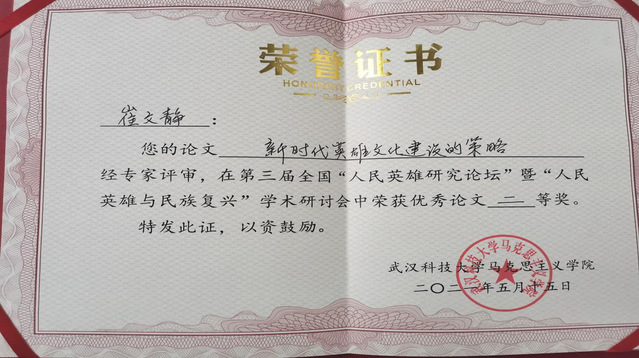 5月15日,学院20级学科教学(思政)专业崔文静同学参加第三届全国“人民英雄研究论坛”暨“人民英雄与民族复兴”学术研讨会。会议由武汉科技大学国产视频 、湖北省意识形态建设研究院和人民英雄网在武汉科技大学(黄家湖校区)举办。崔文静同学在会议的研究生分会场上交流发言,并荣获优秀论文“二等奖”。