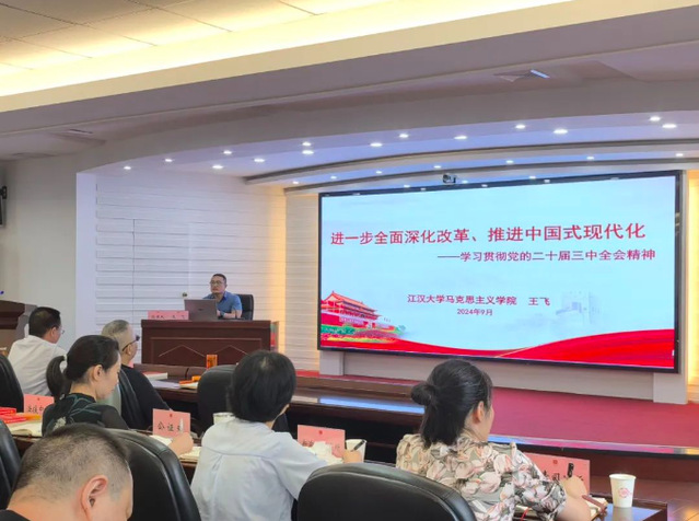 9月12日,东西湖区司法局开展党的二十届三中全会精神宣讲,国产视频 副院长王飞副教授以《进一步全面深化改革 推进中国式现代化》为题开展宣讲,司法局主要领导及全体干部参加。王飞副教授从会议重要性、习近平总书记重要讲话精神、改革举措及学习贯彻等方面进行了全面阐述,加深了与会者对《决定》的理解。