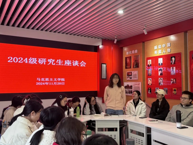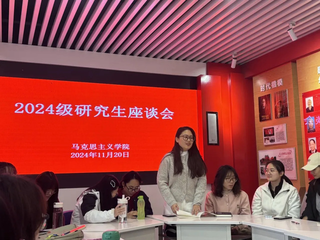 座谈会上,2024级研究生依次发言,谈入学以来的学习体会与感悟,以及对学院的意见或建议。马克思主义理论的方宁同学提到入学以来的收获与感悟是要打好理论基础,合理安排时间。马克思主义理论的杨淑婷同学谈到除了课上的学习很重要以外,课外的学习也很重要,希望学院多举办一些课外实践活动。