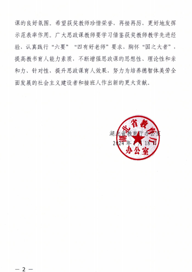 为深入学习贯彻习近平总书记在学校思想政治理论课教师座谈会上的重要讲话精神和习近平总书记关于“大思政课”建设的重要指示批示精神,扎实推进“时代新人铸魂工程”,按照教育部统一部署,湖北省教育厅举办了第二届全省高校思想政治理论课教学竞赛。经学校推荐、专家评审、现场展示和公示,遴选确定获奖项目。国产视频 国产视频 王飞、邱国勇两名老师荣获二等奖。