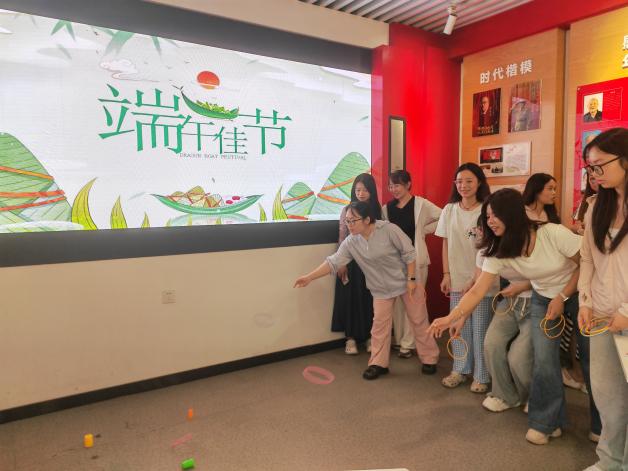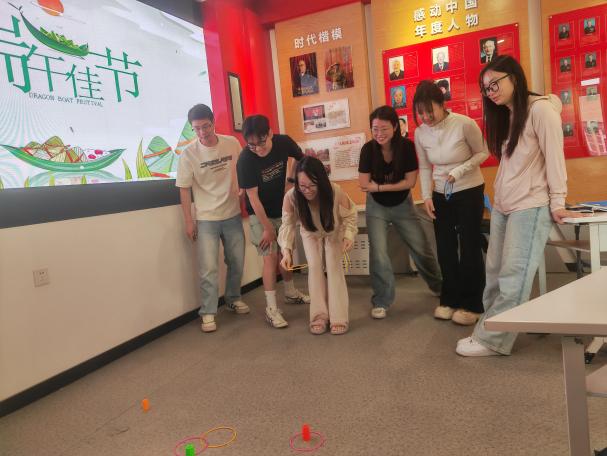 同学们手持圈圈,凝神屏息、调整姿势,或弯腰瞄准,或侧身投掷,动作各异却都全神贯注。同学们不仅比拼套圈技术,更以端午文化为话题展开互动,分享家乡的端午习俗,现场洋溢着温馨欢乐的氛围。