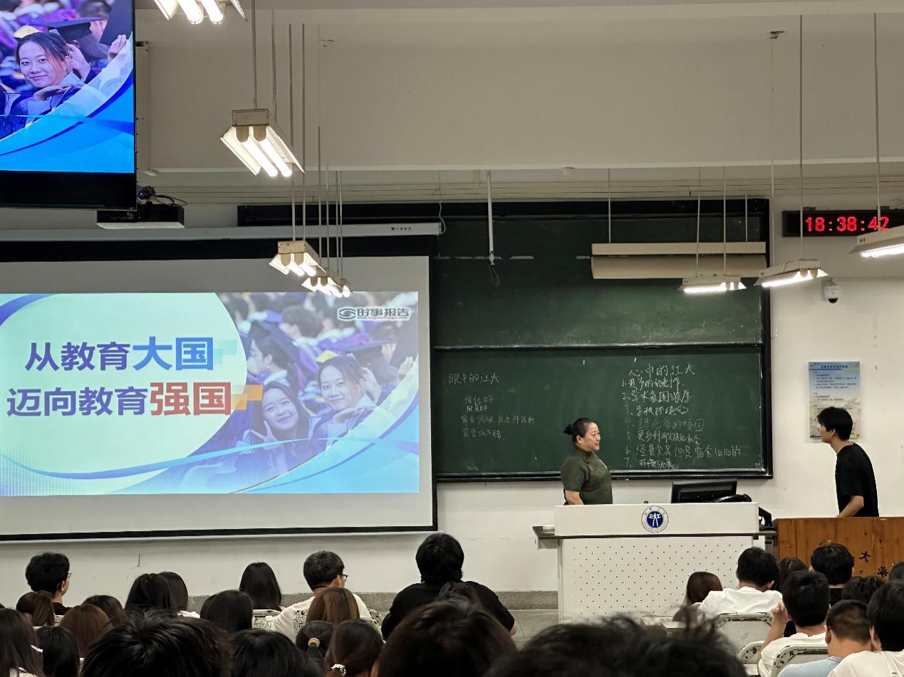 6月5日晚,副校长向悦为光电材料与技术学院2024级160余名学生讲授了形势与政策课,课程主题聚焦如何从教育大国迈向教育强国。她从“大家眼中的江大和心中的江大分别是什么样子?”问题入手,从江大的发展变化引申开来,从新中国建设以来教育的发展历程及现状、我国的教育成绩、怎样建设教育强国,以及江大怎么融入教育强国建设等四个方面进行了课程的讲授。她充分结合学校和学院实际,用生动有趣的案例和互动,深化了同学们对国家教育战略的理解,更指明了江大学子在建设教育强国征程中的责任与方向。