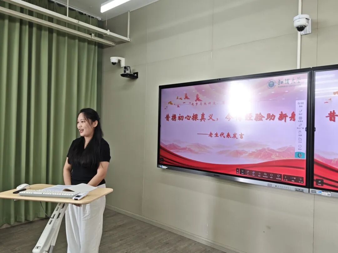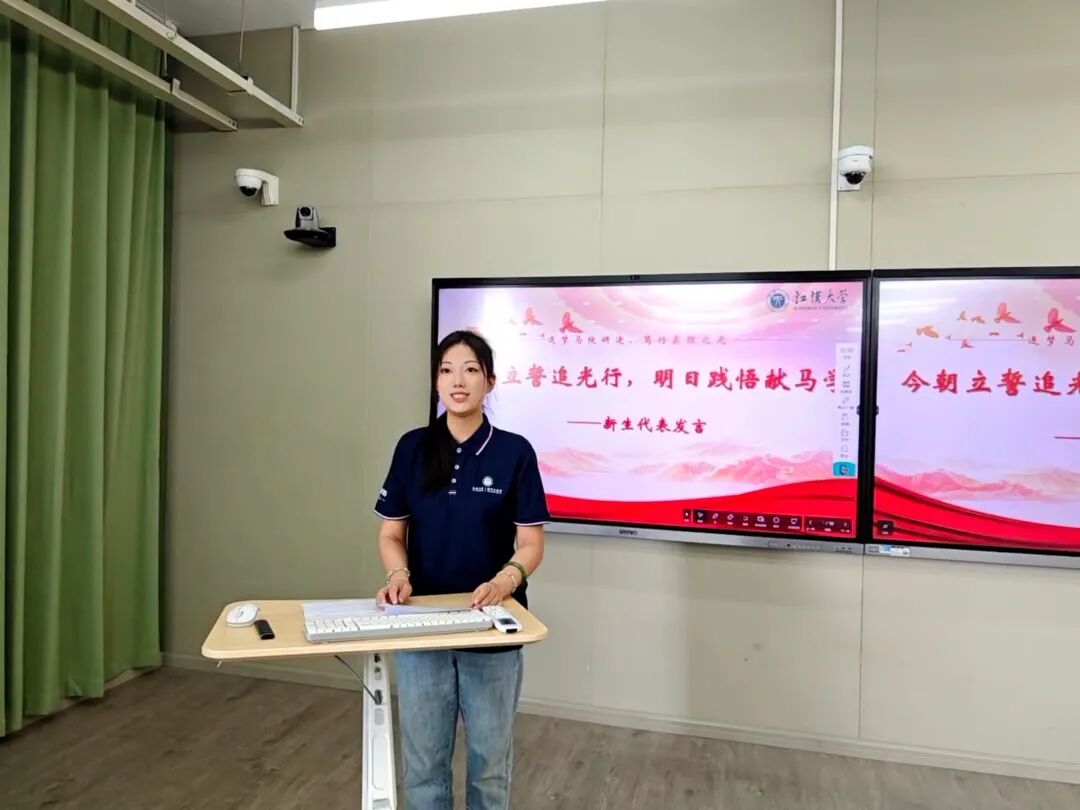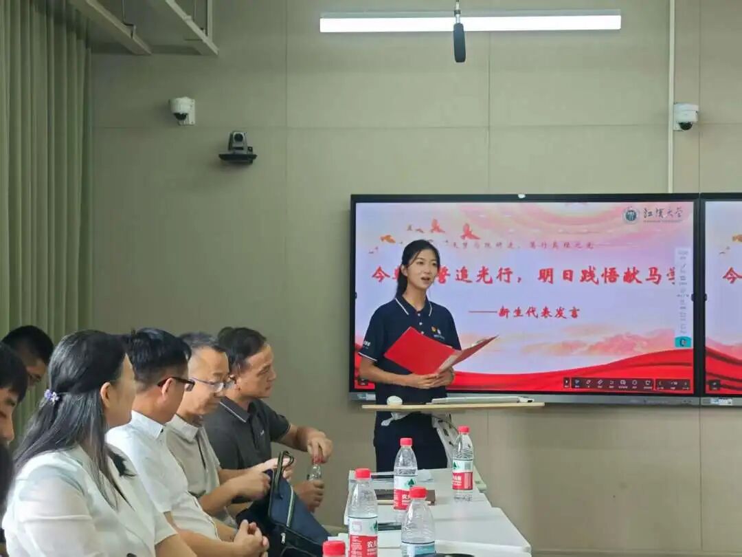 2025级学科教学(思政)专业项婷、马克思主义理论专业唐同悦作为新生代表发言。她们回顾了备考时的拼搏岁月,分享了初入江大校园的真切感受,更表达了对未来学习马克思主义理论的坚定决心——将以青春之力钻研理论、以实干之行践行初心,与全体同学并肩成长,在马院研途中书写属于新时代青年的篇章。