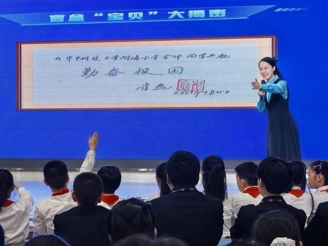 “科学家是什么样的人?台上的人形机器人“聪聪”与屏幕上的智能学伴“楚楚”,引导着学生们,自己讲述赵梓森院士研发光纤、崔崑院士钢铁报国的故事。老师则用一个个“盲盒探秘”互动游戏,解码科学家成长轨迹的过程,将抽象的科学精神化作清晰的知识图谱。来自华中科技大学附属小学的老师杨晓婧用这样充满互动、趣味的方式,让孩子们了解到:“原来科学家是这样的!”