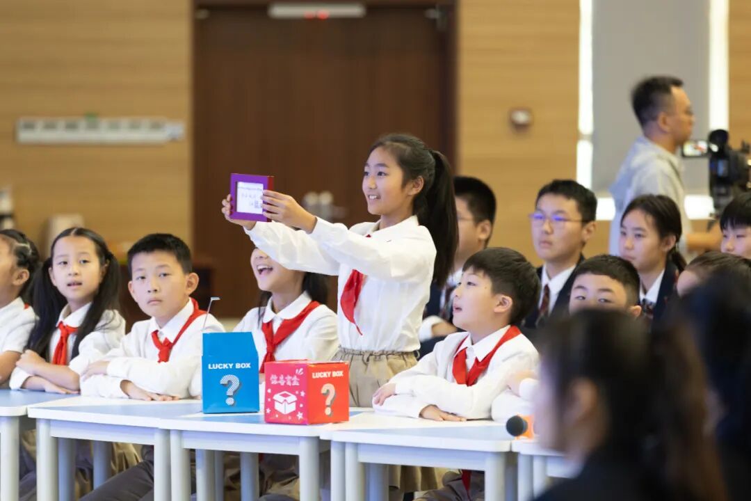 “科学家是什么样的人?台上的人形机器人“聪聪”与屏幕上的智能学伴“楚楚”配合授课教师,运用“盲盒探秘”互动游戏引导着学生自己讲述赵梓森院士研发光纤、崔崑院士钢铁报国的故事,并从中解码科学家们的成长历程,将抽象的科学家精神化作清晰的知识图谱。来自华中科技大学附属小学的杨晓婧老师用这样充满互动、趣味的方式,让孩子们了解到:“原来科学家是这样的!”