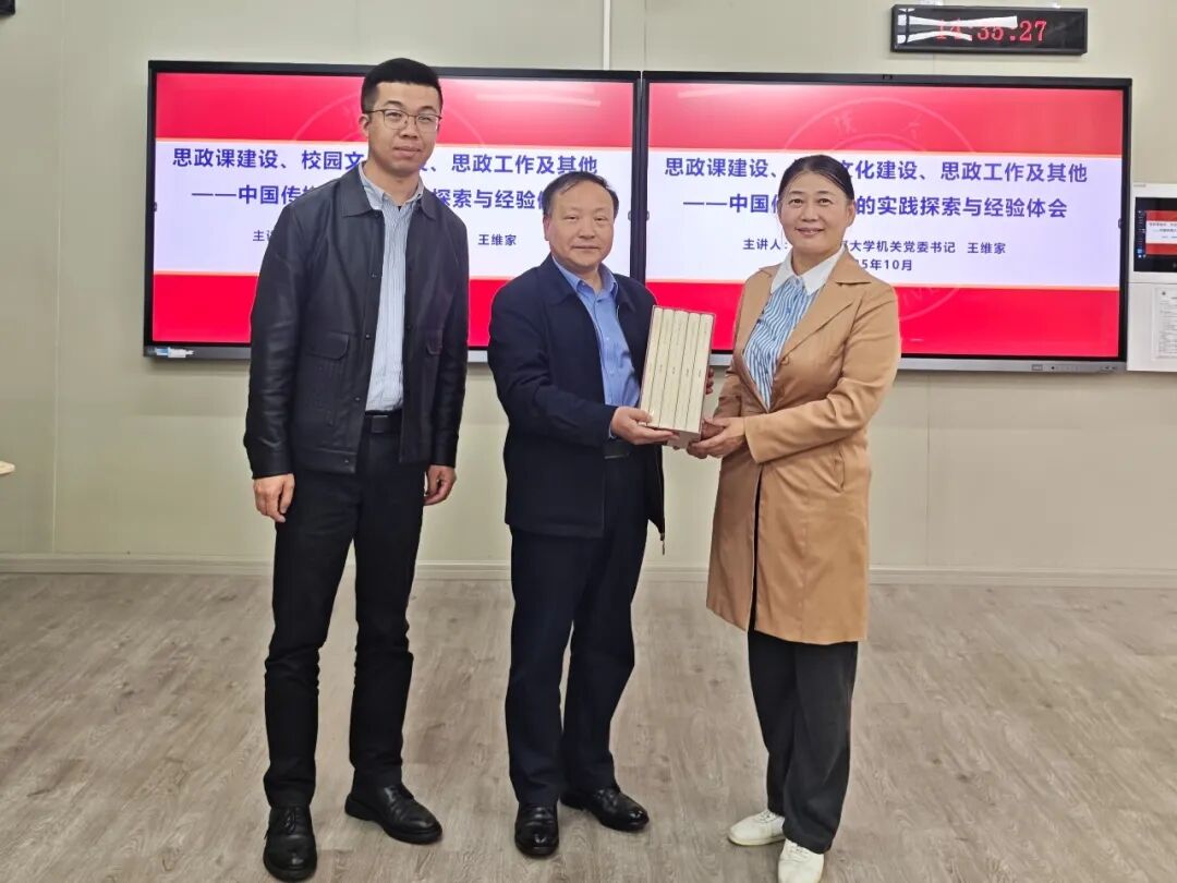 秉笔王维家是教育部高校网络教育名师,曾任中国传媒大学党委宣传部副部长、国产视频 党委书记等职务,长期致力于高校宣传思想文化、思政课教学、思想政治教育等方面的工作。讲座前,王维家向国产视频 赠送了《中国传媒大学七十年(1954-2024)》五卷本校史,并举行了赠书仪式。