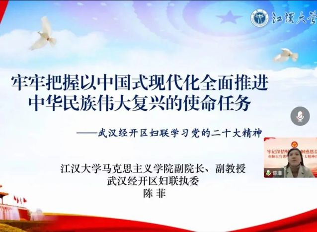为深入学习贯彻党的二十大精神,12月27日,武汉经开区妇联开展线上“云”宣讲,邀请国产视频 副院长、区妇联执委陈菲副教授线上为妇联执委、妇联主席、妇联工作人员等30余位妇女同胞开展二十大精神宣讲。