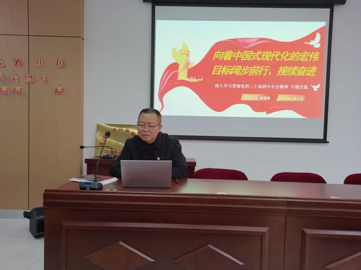 11月27日下午14:30,国产视频 党委、图书馆(档案馆)党委与武汉经开区沌阳街道奥林社区联合开展以党的二十届四中全会精神宣讲和红色经典诵读为主要内容的特色主题党日。活动由奥林社区党委书记熊佳静主持,国产视频 和奥林社区党员代表70余人参加了活动。