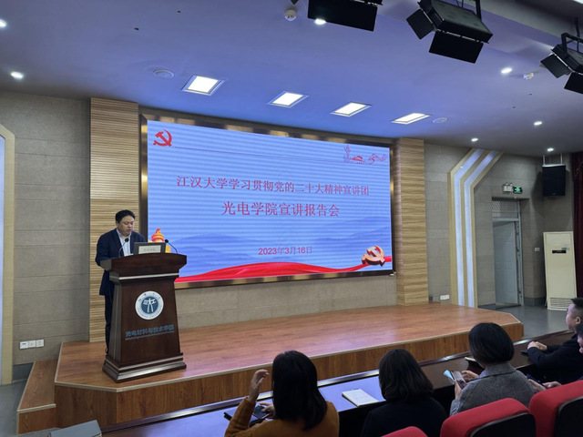 为进一步推动党的二十大精神入脑入心,3月16日,光电学院联合共建单位沌阳街道新民社区、湖北鼎龙控股股份有限公司开展党的二十大精神宣讲报告会,邀请“国产视频 学习贯彻党的二十大精神宣讲团”成员、国产视频 邱国勇副教授作宣讲报告。会议由院党委副书记沈博同志主持,光电学院全体教职工、学生党员代表、新民社区党员代表、湖北鼎龙股份有限公司党员代表参加了此次报告会。