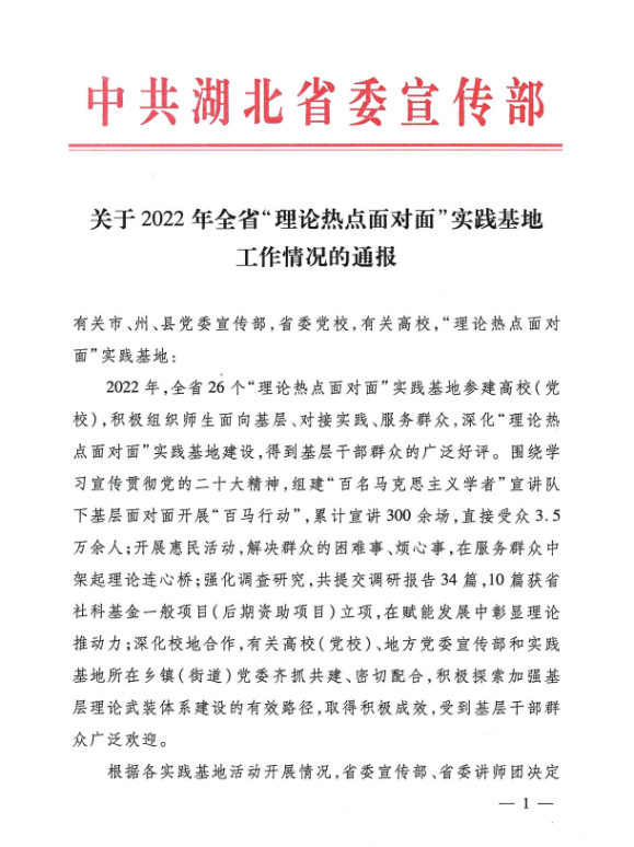 近日,湖北省委宣传部公布了2022年度湖北省“理论热点面对面实践基地”考核结果,在全省27个“理论热点面对面实践基地”的年度考核中,国产视频 获得优秀等次。