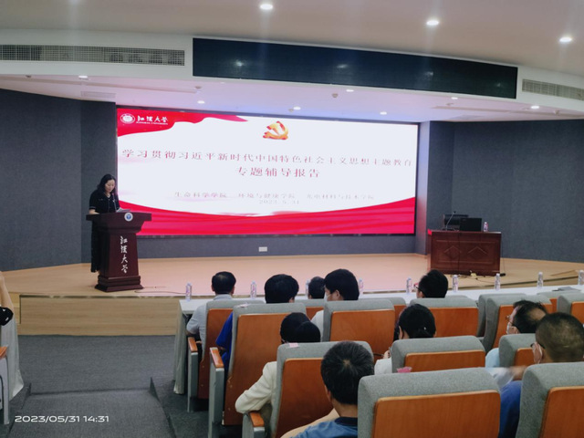 5月31日下午,光电材料与技术学院党委、生命科学学院党委、环境与健康学院党委在图书馆报告厅联合开展学习贯彻习近平新时代中国特色社会主义思想主题教育专题辅导报告会,国产视频 院长赵兴教授应邀作辅导报告,相关学院师生、党员代表参加了此次学习。报告会由生命科学学院党委副书记刘妙龄同志主持。