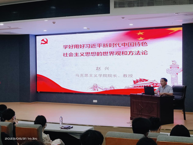 赵兴教授以《学好用好习近平新时代中国特色社会主义思想的世界观和方法论》为题,从习近平新时代中国特色社会主义思想的世界观和方法论概述、蕴含的哲理学理道理、实践逻辑及用好习近平新时代中国特色社会主义思想的世界观和方法论以及奋力谱写“双一流”建设新篇章4个方面进行了生动阐述,主题鲜明、思想深刻。