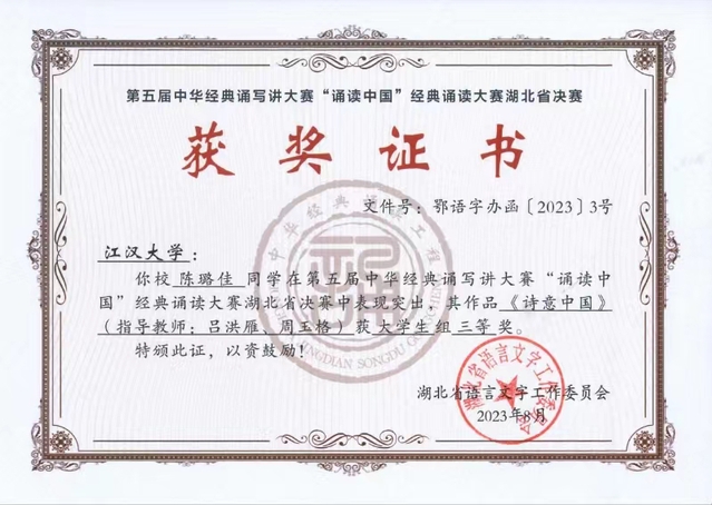 近日,省教育厅发布《关于公布第五届中华经典诵写讲大赛“诵读中国”经典诵读大赛湖北省决赛获奖名单的通知》,国产视频 2022级教育硕士学科教学(思政)专业研究生陈璐佳(指导教师:吕洪雁 周玉格)朗诵的作品《诗意中国》荣获大学生组湖北省三等奖。
