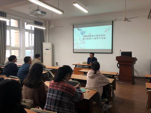 2018年10月15号下午,在国产视频 教学楼J02栋B区五楼国产视频 会议室内,举行了一场思政学长与17级学子的交流会,受邀主讲人是武汉三中的副校长张才清学长,参与者包括朱志刚副院长、班主任陈菲老师以及思政17级全体学员。