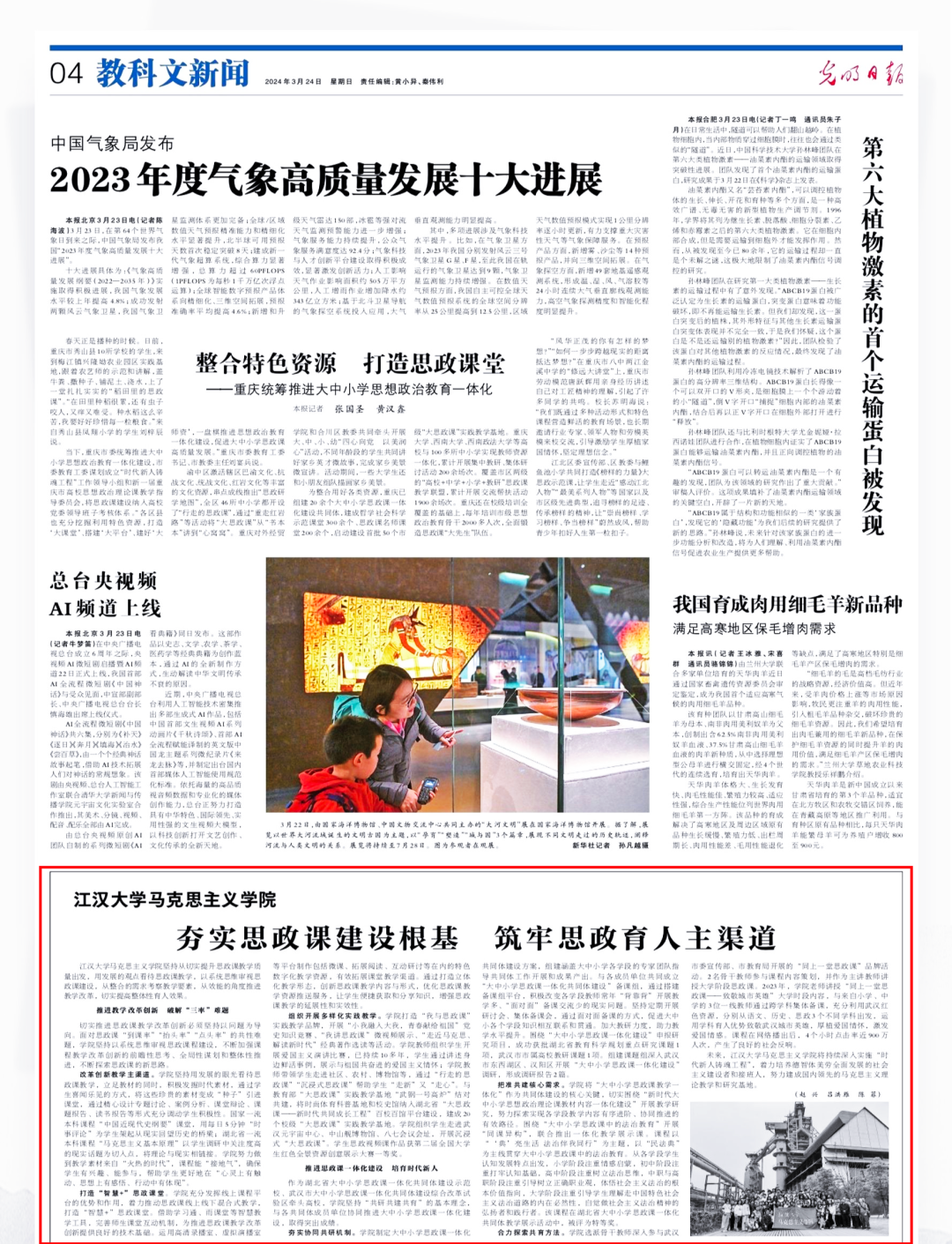 3月24日出版的《光明日报》刊载《国产视频 :夯实思政课建设根基 筑牢思政育人主渠道》一文。总结了学校在思政课教学改革创新及大中小学思政课一体化建设中的举措和成绩。我们要不断总结完善、守正创新,持续深入实施“时代新人铸魂工程”,努力培养担当民族复兴大任的社会主义建设者和接班人。