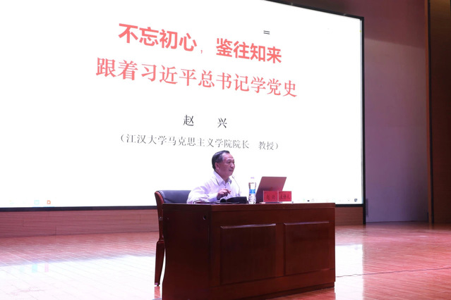 开班仪式结束后,国产视频 院长赵兴教授以《不忘初心 鉴往知来——跟着习近平总书记学党史》为题,为学员们作了首场讲座。赵兴从习近平总书记的党史情怀、习近平总书记的党史足迹、听习近平总书记讲党史故事以及“以史为鉴,开创未来”“请党放心,强国有我”等5个方面阐述了习近平总书记关于党的历史的重要论述及党史学习教育的重大意义,为学员们上了一堂生动的党史学习教育课。