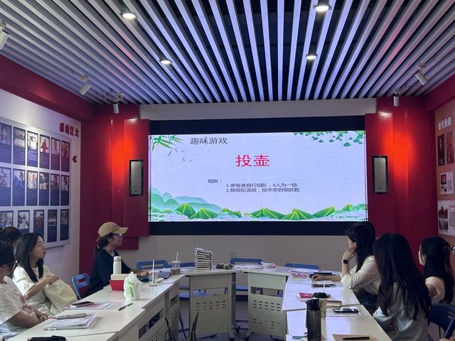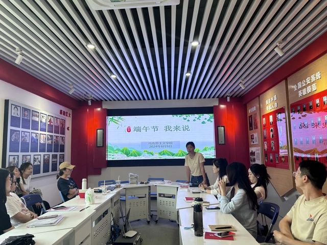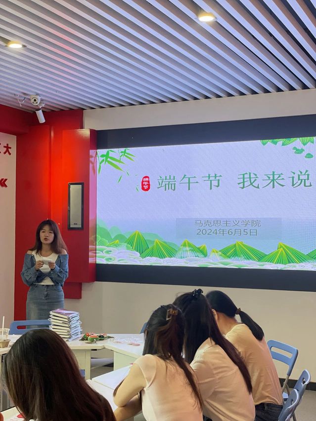 在端午节文化科普与分享环节,来自贵州贵阳的卢艳同学率先做了分享,她介绍了家乡人在过端午节时会包粽子、挂艾草,饭后会散步有助于强身健体;来自江西抚州的黄娟同学谈到,家乡的人在过端午节时也会包粽子,会用五彩丝线编织蛋篓装上鸡蛋给儿童挂在脖子上,据说可以避免蚊虫鼠蚁的叮咬;来自湖北武汉的陈璐佳同学以楚文化为起点,给学生们介绍了端午节的由来,以及武汉在过端午节时会进行赛龙舟,包粽子以及挂艾草等活动;来自山东临沂的王文文同学介绍到,家乡的人在过端午节时会包粽子,喝雄黄酒以及挂艾草,比较特别的是家乡的老人会在清晨采露水,给儿童沐浴,寓意着福气和吉祥。党支部书记周玉格老师给学生们详细介绍了端午节一系列习俗的缘由,使学生更加深入了解端午节的历史与文化,增强了对传统文化的认识与尊重。