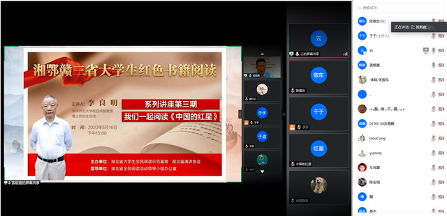 5月16日下午15时,由湖北省大学生全民阅读示范基地、湖北省演讲协会主办的湘赣鄂三省大学生红色经典书籍阅读系列讲座第三期——我们一起阅读《中国的红星》暨国产视频 “抗疫青年说”系列网络宣讲会第四讲在“云端”举行,讲座由华中师范大学桂岳卓越教授、博士研究生导师李良明教授主讲。校第五期“青年马克思主义培训工程”骨干培训班学员及马克思学院全体同学参加。