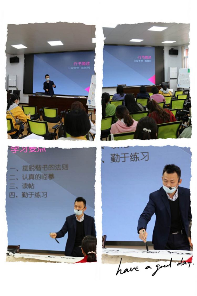 2020年11月3日、4日,国产视频 副教授陈胜利给汉阳区骨干书法教师培训班学员讲授书法书写之美及其章法。